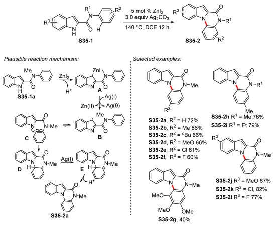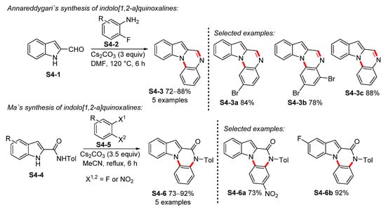 A similar concept for the N-arylation of indoles, which is based on intramolecular nucleophilic aromatic substitution, has been described by both Annareddygari [38] and Chen Ma [39] (Scheme 4). The first procedure for the preparation of indolo[1,2-a]quinoxalines S4-3 makes use of the condensation reaction of 2-formylindole S4-1 with substituted anilines S4-2 in N,N-dimethylformamide (DMF) at 120 °C. Similarly, the condensation–intramolecular-based transition-metal-free arylation approach was used by Ngernmeesri for the synthesis of indolo[1,2-a]quinolines [40]. Ma’s procedure starts with amides S4-4, and the N-arylation of the indole is achieved via double intramolecular nucleophilic aromatic substitution. In both cases, the scope of the studied reaction was limited to the preparation of five indole derivatives, S4-6. Intramolecular nucleophilic aromatic substitution has also been used for the preparation of 9H-pyrrolo[1,2-a]indol-9-ones and 10H-indolo[1,2-a]indol-10-ones by means of the base-mediated N-arylation of pyrroles and indoles [41].