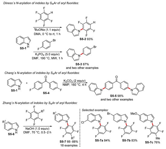 Intermolecular nucleophilic aromatic substitution can also be used to prepare N-arylindoles (Scheme 5). This concept for the preparation of N-arylindoles is usually based on the reaction of aryl fluorides with indoles under basic conditions. Diness et al. developed two procedures for the preparation of N-arylindoles. In the first procedure, the reaction of pentafluorobenzene with an indole in the presence of tBuONa afforded N-arylindole S5-2, which was then used for the preparation of pentasubstituted benzene (Scheme 5, Diness’s N-arylation of indoles) [42]. The analogous reaction with a halogenated aromate containing only one fluorine atom proceeded under harsh reaction conditions, as illustrated by the selected synthesis of indole S5-3. However, the overall reaction scope was limited to three examples of N-arylated indoles [43]. Similar reaction conditions were used for the preparation of bis N-arylindoles with structures represented by the indole S5-5 (Scheme 5, Chang’s N-arylation of indoles). The prepared N-arylindoles were polymerized, and their optical and electrochemical properties and thermal stability were determined [44]. The results summarized in Scheme 5 indicate that the use of nucleophilic aromatic substitution for the preparation of N-arylindoles proceeds best in the case of pentafluorobenzenes. This conclusion was confirmed by the work of Zhang [45], who prepared a series of tetrafluorophenylbenzenes through the reaction of indoles with pentafluorobenzenes in the presence of sodium hydroxide under mild reaction conditions (Scheme 5, Zhang’s N-arylation of indoles). Similar reaction conditions (KOH, DMSO, 100 °C, 24 h) were used by Hua to prepare a series of N-arylated indoles (23 compounds, 24–87% isolated yields) [46].