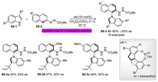 The organocatalytic preparation of N-aryl carbazoles and indoles was reported in 2020 (Scheme 6) [51]. The reaction between the azonaphthalene S6-2 and N-nucleophiles was catalyzed by chiral phosphoric acid derivatives. Although the majority of reported N-arylations have been performed on carbazole (26 examples), the reaction has also been used for the preparation of ten N-arylindoles. It was proposed that the formation of the reaction products S6-3 involves the asymmetric nucleophilic addition of indoles S6-1 to the reaction center, and that the final product of the reaction S6-3 is obtained via rearomatization. Unfortunately, the scope of the reaction was limited to azonaphthalene S6-2, and the scope of the indoles was also limited.