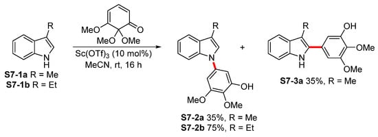 A different approach to the N-arylation of indoles, which involves aza-Michael addition and aromatization, was reported in 2018 (Scheme 7) [52]. The developed methodology is based on the reaction of azoles with cyclohexa-2,4-dienones in the presence of a catalytic amount of scandium triflate in acetonitrile. The procedure can be used for the regioselective preparation of N-aryl pyrazoles, 1,2,4-triazoles, benzimidazoles, and 1,2,3-benzotriazoles in high yields. In the case of substituted indoles, the low selectivity of the arylation reaction was observed. Thus, 3-methylindole S7-1a reacted with the starting dienone to form a mixture of C2- and N-arylated indoles S7-2a and S7-3a. By contrast, 3-ethylindole S7-1b exclusively gave N-arylindole S7-2b in a 75% yield. The observed reactivity was not explained.