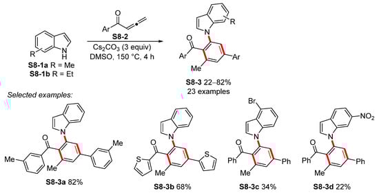 The transition-metal-free synthesis of N-arylindoles S8-3 from 1,2-allenic ketones S8-2 and variously substituted indoles S8-1 via a Cs2CO3-promoted tandem benzannulation reaction has recently been demonstrated by Li et al. (Scheme 8) [53]. The substrate scope with respect to both indoles S8-1a and S8-1b and allenic ketones S8-2 is quite broad. Interestingly, the C2-substituted indoles were either unreactive or reacted poorly under the reaction conditions, likely due to steric hindrance. A mechanism that involves a series of Michael additions followed by cyclization and benzannulation may be operative, as proposed by the authors.
