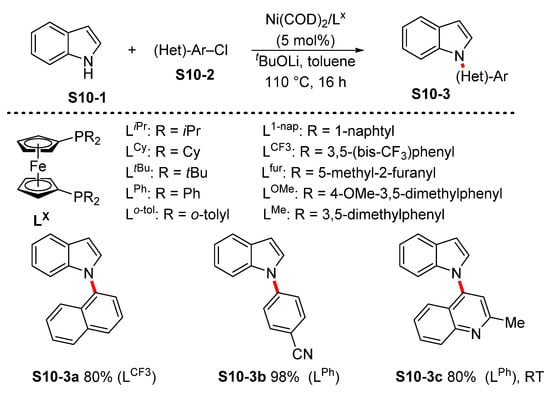 Different catalytical systems for the N-arylation of indoles were studied by Stradiotto [55], who investigated the reactivity of DPPF-based ligands (Scheme 10) during the Ni(0)-catalyzed N-arylation of indoles (Scheme 10). Heteroaryl chlorides were coupled with alkylamines and indole in the presence of ten structurally diverse 1,1′-bis(bis(alkyl/aryl)phosphino)ferrocene ligands (LX) and Ni(COD)2. The electron-poor ligand LCF3 proved to be extremely potent. It was the only ligand that gave the N-arylated indole S10-3a bearing a naphthyl substituent in a 80% yield. By contrast, the N-arylation of an indole with 4-chlorobenzonitrile proceeded efficiently with several LX variants, including LiPr, LCy, LPh, LCF3, LOMe, and LMe. The amination of 4-chloroquinaldine with the ligand LPh represents the first room-temperature N-arylation of an indole. In addition, ligands with ortho-substituted phenyl (Lo-tol and L1-nap), a sterically demanding dialkylphosphino group (LtBu), and difuranylphosphino variants (Lfur) proved ineffective under the studied conditions. The comparable catalytic performance of LPh, LCF3, and LOMe in the studied nickel-catalyzed N-arylations suggests that the electronic perturbations arising from arylphosphine substitution do not significantly affect the behavior of nickel in this branch of chemistry.