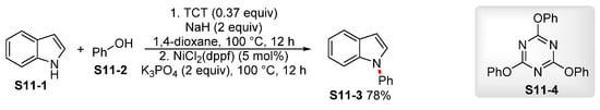 A different procedure for N-arylation is based on the reaction of amines or heterocyclic compounds with phenols (Scheme 11) [56]. Phenols are reluctant to react during cross-coupling reactions, so the starting phenol is converted into a cyanuric acid ester S11-4 via the reaction with cyanuric chloride (TCT) in 1,4-dioxane in the presence of a base. The conditions for the formation of the cyanuric acid ester S11-4 were obtained through extensive optimization. For example, the N-arylation of indole S11-1 with activated phenol S11-4 was performed using the NiCl2(dppf) catalytic system to give the N-arylated indole S11-3 in a 78% yield. Morpholine, carbazole, indoline, and pyrazole are examples of the other tested amines.
