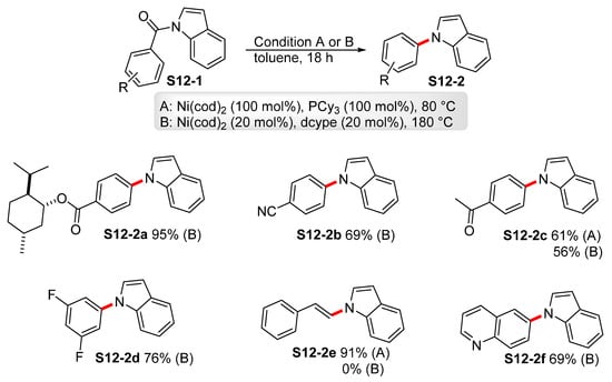 The nickel-catalyzed decarbonylation of substituted N-acyl indoles S12-1 represents another approach for the preparation of N-arylated indoles (Scheme 12) [57]. Two conditions were optimized for the Ni(0)-catalyzed decarbonylation of the starting indoles. First, stoichiometric amounts of Ni(cod)2 and PCy3 preferred quantitative decarbonylation at 80 °C (Condition A). Second, catalytic decarbonylation was achieved through the use of the 1,2-ethanediylbis[dicyclohexyl]phosphine (dcype) ligand at 180 °C (Condition B). Condition B proved to be suitable for N-acylindoles bearing an electron withdrawing group, whereas Condition A was suitable for N-acylindoles bearing an acyl group with electron-neutral and electron-rich substituents. Selected examples S12-2a–S12-2f indicate that this method tolerates esters, nitriles, and the ketone functional group. In addition to benzoic acid derivatives, this method has proven suitable for the formation of N-alkenylindoles S12-2e and N-heteroarylindoles S12-2f.