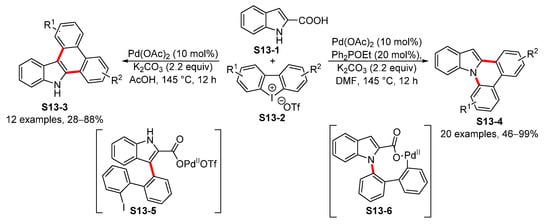 Similarly to the palladium-catalyzed arylation of pyrroles, the formation of 1, 2, and 3-arylated indoles can also be observed in the palladium-catalyzed arylation of indoles (Scheme 13) [65,66,67]. The regioselectivity of palladium-catalyzed indole arylation can be influenced by the detailed optimization of the reaction conditions. This was demonstrated in 2019 by Zhang et al., who reported the palladium-catalyzed cascade decarboxylative arylation of indoles [68]. The authors optimized the course of the reaction of indolyl carboxylic acids S13-1 with diaryliodonium salts S13-2 and determined that N1/C2 or C2/C3 arylations of indoles can be performed with high regioselectivity. The reaction allows the introduction of variously substituted biphenyls. The proposed key intermediates for both C2/C3 and N1/C2 arylation, S13-5 and S13-6, show that the N-arylation of indoles is the first step in N1/C2 arylation. However, the C3 arylation of the starting material occurs first in the case of C2/C3 arylation of the starting indolyl carboxylic acid S13-1.