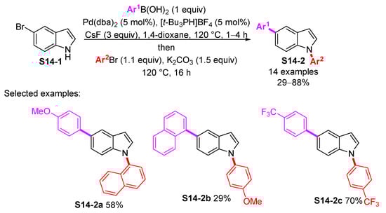 A different approach for the preparation of diarylated indoles was reported in 2020 (Scheme 14) [69]. Muller et al. used 5-bromoindole to prepare diarylated indoles via sequential Suzuki reaction and Buchwald–Hartwig amination. The Suzuki reaction was performed first to avoid any side reactions. The subsequent amination reaction uses the same catalytic system as the Suzuki reaction, although potassium carbonate is used instead of CsF. Selected examples S14-2a and S14-2b illustrate how the Suzuki reaction of bromoindole S14-1 with 1-naphthylboronic acid gives worse yields of the indole S14-2b than the Buchwald–Hartwig amination with naphthyl bromide. This approach is also suitable for the preparation of diarylated carbazoles and 10H-phenothiazines.