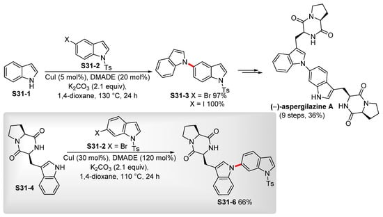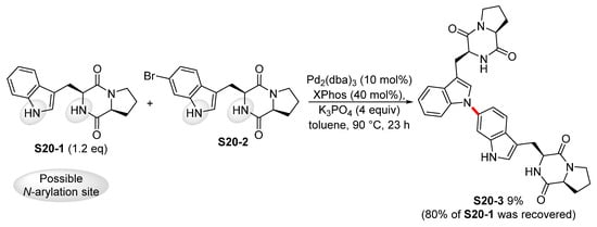 Palladium-catalyzed N-arylation of indoles has been used for the total synthesis of (–)-aspergilazine A (Scheme 20) [80]. In this report, the preparation of (–)-aspergilazine A (S20-3) was achieved by means of a cross-coupling reaction between non-brominated S20-1 and brominated indole S20-2 to form (–)-aspergilazine A (S20-3) at a 9% yield. When evaluating this approach to (–)-aspergilazine A, it should be noted that the starting substances contained four N–H bonds that could be arylated. In addition, 80% of the unreacted starting material S20-1 was isolated together with the reaction product S20-3.