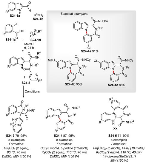 A similar approach for the intramolecular cyclization of Ugi adducts was reported by Liu in 2013 (Scheme 24) [108]. In this approach, the Ugi reaction is carried out among 2-indolylcarbaldehyde S24-1a, 2-iodobenzoic acid S24-1c, amine S24-1b, and isonitriles S24-1d. The Ugi adduct S24-2 is subsequently cyclized under different conditions. The N-arylation products S24-4 are obtained via a copper-catalyzed reaction in the presence of an L-proline ligand. The products of 2,3-cyclization S24-5 are formed during the palladium-catalyzed reaction. Cyclization performed without a transition metal produced isoindolin-1-ones S24-3. The scope of the discovered transformations is limited to a few examples, although a more extensive scope was reported by the same author in 2014 [109].