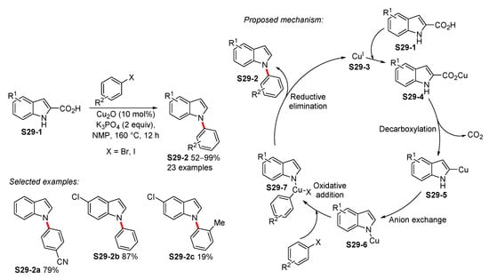 - Zhang, Y.; Hu, Z.-Y.; Li, X.-C.; Guo, X.-X. Copper-Catalyzed Decarboxylative N-Arylation of Indole-2-carboxylic Acids. Synthesis 2019, 51, 1803–1808. [Google Scholar] [CrossRef]