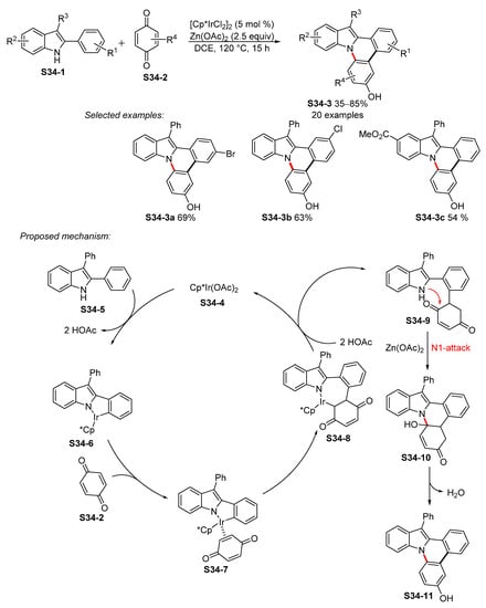 - Guo, S.; Liu, Y.; Zhang, X.; Fan, X. Iridium-Catalyzed Oxidative Annulation of 2-Arylindoles with Benzoquinone Leading to Indolo[1,2-f]phenanthridin-6-ols. Adv. Synth. Catal. 2020, 362, 3011–3020. [Google Scholar] [CrossRef]