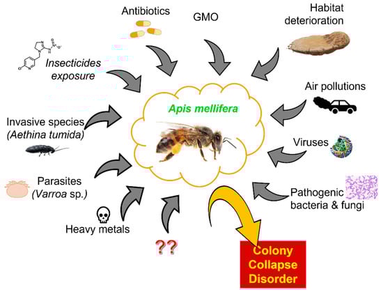 Given the importance of pollinators in relation to global food, the decline in bee numbers is at least worrying [62]. After the collapse of a colony, immature bees and food remains are often found in the hives. This means that the death of worker bees was probably sudden and early [63]. Pollinators affected by CCD show many changes in rectum symptomology, which may indicate that these individuals have a problem with water regulation [64]. This phenomenon can be caused by various reasons. One of them is habitat deterioration. Human activities led to degradation, fragmentation, and destruction of natural habitats. Changes in the landscape structure affected bees and pollinated plants. Degradation of the natural environment of pollinators caused a reduction in the amount of bee food and changes in the bee population [65]. Another factor contributing to the decline in the number of bee colonies is GMO, which may have the potential for sub-lethal effects on bees, thus disrupting their feeding behavior [66]. Viruses are a known health threat to bees. In some cases, they can cause lethal diseases and lead to the death of an entire colony. Viruses can infect bees at various stages of development and drastically shorten their lives [67]. Invasive species are another factor. An example of such a species is, for instance, a small beetle inhabiting hives (Aethina tumida species), which colonized Australia and North America and is a threat to Europe, as its larvae destroy stored pollen and honey [68]. Another invasive species that pose a huge threat to bees are wasps that steal their larvae, honey, and adult individuals to provide protein and sugar for their brood and themselves [69]. Another factor triggering CCD is air pollution, which hinders the relationship between flowers and pollinating insects. Pollution affects the chemical components that plants use to lure insects which, as a result, makes it difficult for bees to locate food sources [70]. Chemical compounds (e.g., pesticides, antibiotics, heavy metals), microorganisms, and parasitic mites are very crucial driving forces of pollinator population instabilities, which will be discussed in more detail later in this review. They significantly affect bee health and contribute to CCD. Their negative impact on bees causes a drastic decrease in the number of pollinators in the colony [63,71]. It is important to emphasize that, in most cases the factors mentioned above do not work in isolation. Usually, the interactions between them lead to damage and differ in different parts of the world [72]. Some factors influencing CCD are presented in Figure 1. They were reviewed in detail by Hristov et al. [73].