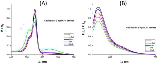 The absorbance and emission spectra of 4 after the addition of up to 8 equiv. of putrescine is presented in Figure 3 (further amine results are available in the Supplementary Materials). The absorbance spectra revealed three regions of interest, two with an intensity increase (512 and 649 nm) and the third (at 551 nm) where a quench was observed as the molar equivalents of putrescine increased. The intensity enhancement regions can be used to monitor the presence of putrescine in the concentration range (0 to 122 μM). The region between 649 and 657 nm is particularly interesting due to the enhancement of the absorbance; the same behavior was observed for cadaverine (please refer to the Supplementary Materials, Figure S29, and for different concentrations of cadaverine (0.1–40 equiv.) please refer to Figures S30 and S31). The excitation of 4 in the presence of 8 equiv. of putrescine at 649 nm did not lead to a new emission band, the same being true for the other BAs. Analyzing the emission spectra, a quench percentage of 55% was obtained for an addition of 8 equiv. of putrescine, much higher values than those observed for n-butylamine and cadaverine (12% and 32%, respectively), whereas for t-butylamine, a slight increase was obtained (6%).