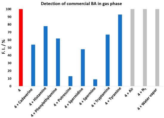 To demonstrate that rosamine 4 can be used in the detection of volatile amine vapors, which are highly toxic, irritant, and corrosive, being important indicators of food quality, for example, in the assessment for fish freshness [], we investigated its reactivity toward BAs in the gas phase. The study was carried out by injecting vapors of different commercial BAs in solutions of 4 dissolved in acetonitrile (see the Materials and Methods section for more details and the apparatus in Figure S32 in the Supplementary Materials). The spectrophotometrical measurements were carried at 533 nm. As shown in Figure 4, nitrogen, air, and water vapor did not affect rosamine 4, since the value of fluorescence intensity did not change when they were injected. However, when the commercial BA vapor was introduced, a decrease in the fluorescence intensity was observed, which was more expressive upon spermine addition, resulting in decreases greater than 90%, 87% for putrescine, 52% for spermidine, 47% for cadaverine, 32% for tryptamine, 21% for histamine, and 8% for tyramine. The results for putrescine and cadaverine confirmed rosamine 4 sensitivity toward these BAs with higher quenching percentages in the gas phase comparatively to those reported in solution for 8 equiv.