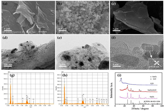 (a) SEM image of GO; (b) SEM image of SnO2; (c) SEM image of SnO2/rGO; (d,e) TEM images; (f) high-resolution TEM image of SnO2/rGO; (g) EDX spectra of GO; (h) EDX spectra of SnO2/rGO; (i) XRD patterns of all samples.