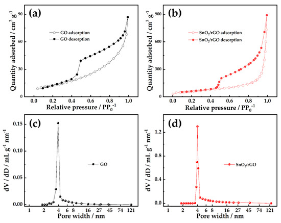 (a) N2 adsorption–desorption isotherms of GO; (b) SnO2/rGO; (c) pore-size distributions of GO; (d) SnO2/rGO based on BJH model.