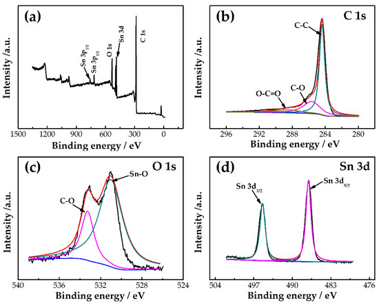 The element composition of SnO2/rGO was further analyzed by XPS. The XPS spectrum survey of SnO2/rGO is shown in Figure 4a. It shows that the peaks in the energy spectrum of SnO2/rGO correspond to C 1s, O 1s, and Sn 3d, indicating that SnO2/rGO consists of C, O, and Sn elements. Figure 4b–d show the high-resolution XPS spectra of C 1s, O 1s, and Sn 3d, respectively. There are three peaks centered at 284.4, 285.6, and 288.6 eV, which correspond to C-C, C-O, and O-C=O bonds, respectively. These C 1s peaks related to oxygen-containing groups are very weak. The peaks at 531.1 and 532.3 eV shown in Figure 4c correspond to Sn-O and C-O bonds. These binding energies are characteristic of oxygen ionization on the SnO2 surface. Figure 4d shows two different peaks with binding energies of 487.0 and 495.4 eV, corresponding to Sn 3d5/2 and Sn 3d3/2, respectively. This indicates the presence of Sn4+ and the formation of SnO2 [49]. It can be concluded that SnO2/rGO is composed of reduced graphene oxide and SnO2.