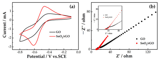 Figure 5b,c show the CVs of GO and SnO2/rGO. As shown in the figure, with the change of the scan rate, the redox peak current also moves up and down. At a larger scan rate, the difference between the oxidation peak potential and the reduction peak potential gradually increases. Figure 5d depicts the relationship between the redox peak current and the square root of the scan rate. It is clear that there is a proportional relationship between the peak current and the square root of the scan rate, indicating that the reaction is controlled by the diffusion process [50]. The slope of SnO2/rGO is higher than that of GO, which may be due to the fact that SnO2/rGO has a better catalytic effect, so that the concentration difference on the electrode surface is larger.