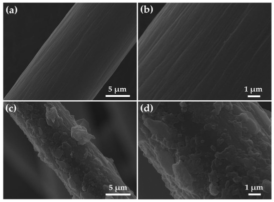 Figure 7 shows the SEM images of pristine graphite felt and graphite felt modified with SnO2/rGO. It is seen from Figure 7a,b that pristine graphite felt presents a clean and smooth surface. The diameter of the carbon fiber is 10–15 μm. It is observed in Figure 7c,d that graphite felt is uniformly coated with the SnO2/rGO catalyst, which offers a larger reaction place and active sites for electrode reaction.