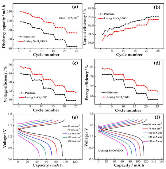 (a) Discharge capacity; (b) CE, (c) VE, and (d) EE of cells with and without SnO2/rGO; (e) charge–discharge curves of pristine cell; (f) SnO2/rGO modified cell at current density of 50–150 mA cm−2.
