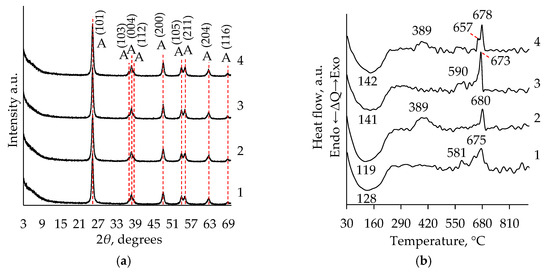 According to the weight-loss trend in the TiO2 aerogel (Figure 1a,b; Table S1), the decrease that started at about 228 °C and continued to ~350 °C and the exothermic peak in the same temperature range (Figure 1c,d; Table S1) corresponds to the removal of solvents and alkoxy groups [35,36]. The STA analysis shows that the exothermic peaks in the temperature range of 366–560 °C were formed (Figure 1c,d; Table 1). Such kinds of peaks are characteristic of anatase formation and were observed in all samples [22]. These peaks can be attributed to the conversion of Ti(OH)4 to TiO2 (dehydroxylation) and occurred during the crystallization of anatase [35,36].