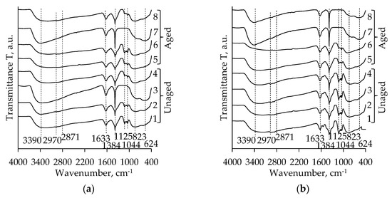 FT-IR spectra of TiO2 aerogels after subcritical drying without aging (1–4) and after 72 h aging (5–8) in dependence of precursor type (TIP (a), TBOT (b)) and solvent used for additional solvent exchange (1, 5—without exchange; 2, 6—CH; 3, 7—nH; 4, 8—DE).