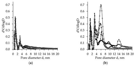 Subcritical dried unaged TiO2 aerogels synthesized from TBOT indicate a relatively narrow bi-modal pores size distribution in the range of 0–5 nm (Figure 5a). The effect of additional solvent exchange is negligible, and all peaks were found at pores with a diameter of 0.97 and 3.10 nm, and the peaks of pores up to 0.97 nm were more than two times higher than those for 3.10 nm. The comparison of curves obtained after ageing with unaged ones indicates that ageing changes the porosity of subcritical dried TiO2 aerogels (Figure 5b). After ageing TiO2 aerogels synthesized using precursor TBOT, highly expressed polydispersity is indicated, where pore size distribution changes from bimodal to trimodal, with a decrease in the first peak height (at a nanopore diameter of about 1.0 nm) and a significant increase of the second peak at a pore diameter of 3.09 nm and an evident appearance of the third peak at 5.92 nm. The height of the third peak was found to be highly dependent on the solvent type used for exchange. The highest and widest third peak was found for additionally nH exchanged TiO2 aerogels. This peak is about 2–6 times higher compared to the TiO2 aerogels exchanged in other solvents. Besides, ageing increases the number of pores with diameters in the range of 8–16 nm.