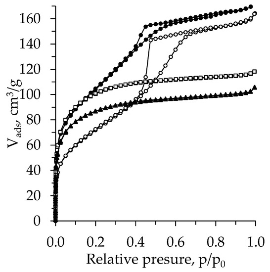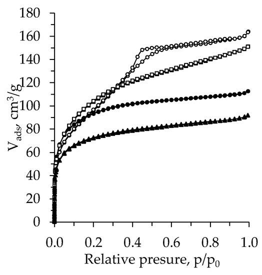 The N2 adsorption–desorption isotherms of the TiO2 aerogel prepared from TBOT are presented in Figure 6. According to the IUPAC classification [47,48], the obtained isotherms can be classified as a type-I with an H4 hysteresis loop, excluding the aged and nH exchanged sample, for which a type-IV isotherm with an H2 hysteresis loop was found. A type-I isotherm and H4 hysteresis loop indicate that the synthesized structure has a microporous and mesoporous structure with narrow slit pores. These data correlate well with the obtained pore size distribution curves presented in Figure 5. A type IV isotherm and H2 hysteresis found for additionally nH exchanged aerogel are typical for the solids with mesopores and micropores [49], whose structure is disordered and the distribution of pore size and shape is not well defined [47,48,49].