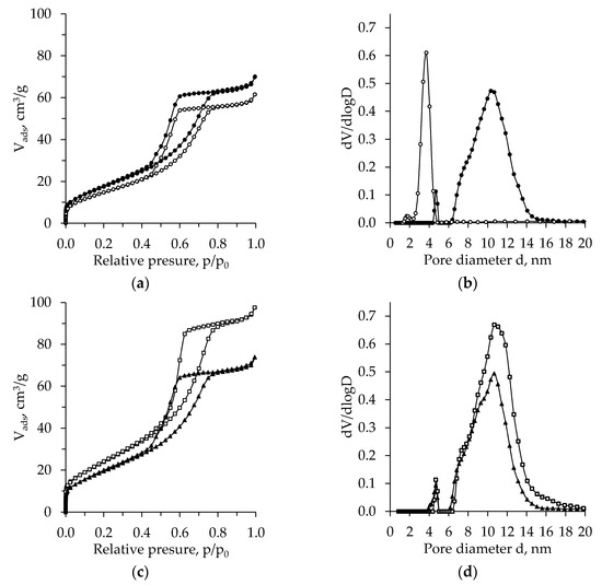 The BET adsorption–desorption isotherms (a,c) and pore size distribution (b,d) of calcinated TiO2 aerogel vs. precursor (TBOT (a,b), TIP (c,d) and aging (●, ▲ –unaged, ◯, □ –aged).
