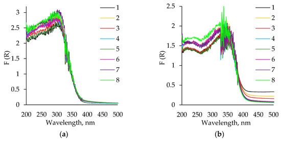 Diffuse reflectance spectra of TiO2 aerogel powders: (a) before calcination; (b) after calcination. 1–4 curves correspond to precursor TBOT and 5–8 to TIP; 1, 3—without aging and solvent exchange; 2, 4—aged, without solvent exchange; 5, 7—unaged, nH exchanged; 6, 8—aged, nH exchanged.