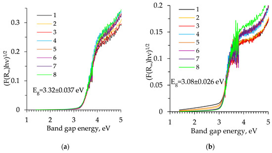Tauc plot of TiO2 aerogel powders: (a) before calcination; (b) after calcination (1–4 curves correspond to precursor TBOT and 5–6 to TIP; 1, 3—unaged and without solvent exchange; 2, 4—aged and without solvent exchange; 5, 7—unaged and nH exchanged; 6, 8—aged and nH exchanged).