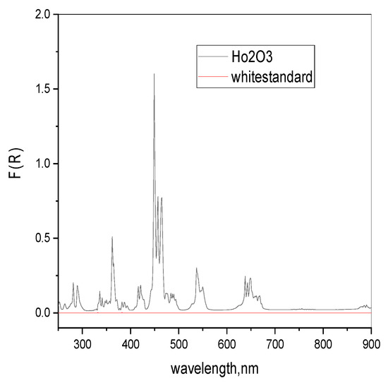 Room temperature diffuse reflectance spectra were measured on a Perkin Elmer (Walham, MA, USA,) Lambda 35 spectrophotometer equipped with a reflectance accessory (RSA-PE-20, Labsphere, North Sutton, NH, USA) and a vertical sample holder with a quartz glass window between 250 nm and 900 nm. As a reference, white and black certified reflectance standards Labsphere® were used. The f-f transitions of Ho2O3 micro powders were used as a reference. Peak maxima and intensities were in good agreement with the theory. From the measured diffuse reflectance R (%), the Kubelka-Munk function F(R) has been calculated [59]. The diffuse reflectance spectra of Ho2O3 powders are visualized in Figure 13.