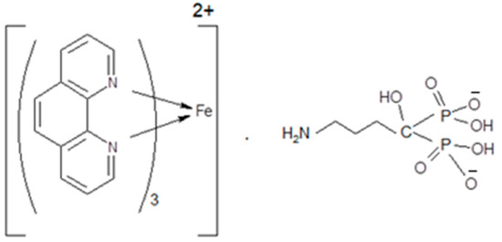 - Kuljanin, J.; Janković, I.; Nedeljković, J.; Prstojević, D.; Marinković, V. Spectrophotometric determination of alendronate in pharmaceutical formulations via complex formation with Fe(III) ions. J. Pharm. Biomed. Anal. 2002, 28, 1215–1220. [Google Scholar] [CrossRef]