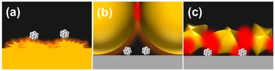 Size-dependent enhancement properties of optical amplifiers have been studied theoretically by the three-dimensional finite-difference time-domain (3D-FDTD) simulation at the gap between two spherical Au NPs, and the highest enhancement was found for the bare Au NPs with a diameter of 120 nm []. However, in this case, the hotspots emerged at the gap more than 50 nm above the surface (Figure 1b). Therefore, target molecules, the size of a few nanometres which are adsorbed on the substrate such as SNPs and a SAC, cannot reach the hotspots to “bask” in the strong electromagnetic fields. In other words, it is not only a matter of the potential enhancing capability of individual Au amplifiers, but also the accessibility of the target samples in the hotspots, which is critically important nanotechnology for achieving our goal. Furthermore, what is important here is to directly observe small samples adsorbed on the substrate as it is. Mounting the samples onto the surface of the amplifier is not suitable as an in situ observation method to elucidate the original spectral features of samples, because this configuration would change the experimental environment of samples that affect crucially the electrical and catalytic properties of the samples, such as the substrate effect.