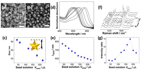 Characterisation of PVP-protected Au nanostars. SEM images of PVP-protected Au nanostars synthesised by different amounts of the seed solution (Vseed). (a) Vseed = 40 and (b) 140 μL, respectively (scale bar: 50 nm). (c) The particle size, acquired based on the measurement of the longest length from the tip apex to the opposite core surface, was plotted as a function of Vseed, where the error bar shows the standard deviation of the size distribution. (d) A series of UV-Vis spectra of Au nanostars synthesised with different Vseed, and (e) SPR peak positions (λSPR) as a function of Vseed. (f) A series of Raman spectra for a dendrimer sample with shell-isolated Au nanostars with different Vseed and (g) the corresponding signal intensity at 1580 cm−1 as a function of Vseed, normalised with that from the blank spectrum acquired in the absence of the Au nanostar.