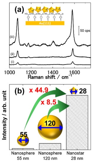 The enhancement properties of the newly developed shell-isolated Au nanostar amplifiers were evaluated using a self-assembled monolayer of mercaptobenzoic acid (MBA-SAM) formed on an Au(111) surface as a standard sample. The corresponding Raman spectra revealed anomalous enhancement factor of nanostar of 1.4 × 109, having practical Raman intensity signals some 44.9 and 8.5 times higher than that of the nano-sphere SHINs with diameters of 55 and 120 nm, respectively (Figure 3).