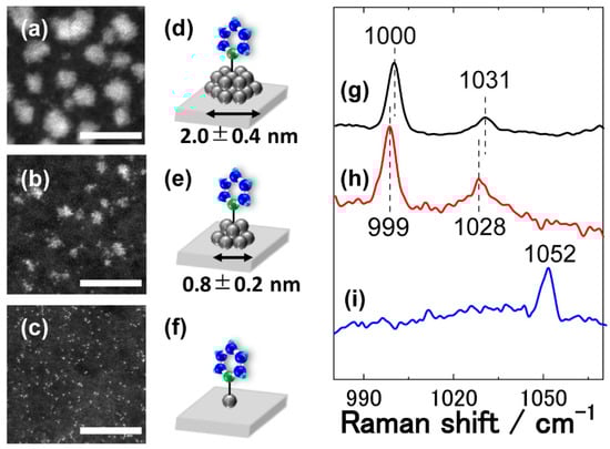 Historically, pyridine (Py) has been used in Raman measurements as a probe molecule to obtain surface information as well as a standard sample in a new Raman technique for comparison purposes with the conventional SERS techniques [,,]. In this study, Pt islands of size range of subnano-metre scale down to a single atom were prepared by the arc plasma deposition (APD) technique on highly ordered pyrolytic graphite (HOPG) substrates under vacuum, where Py was subsequently adsorbed as the probe molecule (Figure 4). The size of the Pt subnano-islands was adjusted in the range from 0.8 to 2.0 nm in diameter by controlling the number of APD pulses (Figure 4a–c; more details given in Supporting Information S2).