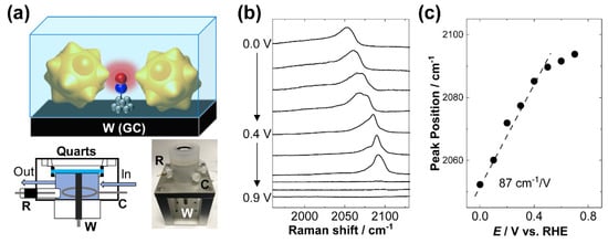 Figure 5b shows the potential-dependent CO stretching Raman spectra for the adsorbed species on Pt subnano-islands with an average diameter of 0.9 nm, revealing a blue shift with a Stark slope of 87 cm−1/V (Figure 5c). This value is notably higher than that for a bulk Pt electrode (32 cm−1/V) [] and commercial Pt catalysts (38 cm−1/V), reflecting a transition of the electronic properties of Pt subnano-islands. This transition of the Stark slope is currently being analysed using DTF calculations with different island sizes to find the main cause of the significant transition of the Stark slope.
