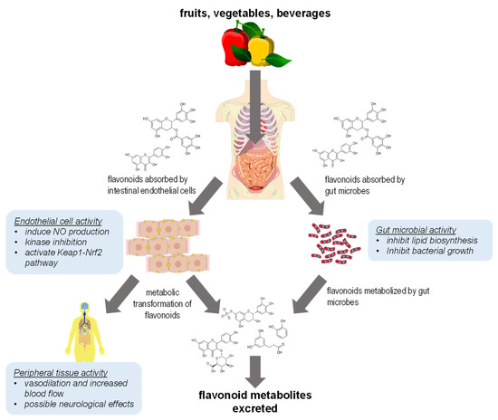 A summary of the most reasonable primary routes of flavonoid bioactivity in humans. Flavonoids will exhibit most of their bioactivity in intestinal epithelial cells and in gut microbial cells. After metabolic degradation by intestinal microflora, microbial metabolites of flavonoids are absorbed by the intestines and excreted.