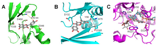 Interactions between flavonoid ligands and proteins from X-ray crystal structures; residues that could either form adducts or be oxidized by flavonoids are labeled. (A) the tyrosine kinase Hck (green) with quercetin (gray) (PDB 2HCK). The distance from K295 to the catechol group of quercetin is within a reasonable distance for electron transfer; (B) human inositol polyphosphate multikinase (IMPK; cyan) with quercetin (gray) (PDB 6M89); (C) prostaglandin F synthase (magenta) with NADPH (cyan) and the quercetin-3-O-glycoside rutin (gray). In all three images, water molecules are shown as red asterisks.