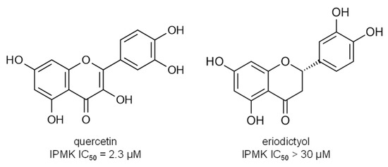 Comparison of structures of quercetin and eriodictyol and their inhibitory activity against human inositol polyphosphate multikinase (IPMK). IC50 values from [108].