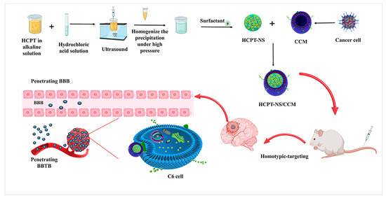 In this study, the drug nanosuspension was wrapped in a glioma C6 cell membrane in order to explore its feasibility in the treatment of brain glioma. Specifically, through the use of insoluble drug nanocrystallization technology, 10-hydroxycamptothecin (HCPT), the model drug, was prepared into the drug nanosuspension (HCPT-NS) using an acid-base microprecipitation combined with a high-pressure homogenization technique. Then, HCPT-NS and the C6 cell membrane (CCM) were fused to obtain the HCPT-NS/CCM. The HCPT-NS/CCM is able to effectively penetrate the BBB and significantly increase drug accumulation at tumor sites in the mouse model of in situ C6 gliomas that were administered via intravenous injection through the tail, thus providing a unique platform for targeting administration of glioma therapy [30].