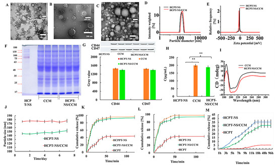 Characterization of HCPT-NS and HCPT-NS/CCM. Transmission electron microscopy images of HCPT-NS (A), CCMs (B) and HCPT-NS/CCM (C). The particle size of HCPT-NS and HCPT-NS/CCM. (D) The Zeta potential of HCPT-NS and HCPT-NS/CCM (E) The membrane protein of the biomimetic nanosuspensions was assessed by running the protein on an SDS-PAGE gel (F) Densitometry analysis of the Western blot (WB) and the relative gray value of membrane-specific proteins CD47 and CD44, n = 3 (G) Detection of the membrane protein concentration of Biomimetic Nanosuspension via the BCA Method. n = 3. (H). CD spectra of CCM and HCPT-NS/CCM (I). Stability of HCPT-NS and HCPT-NS/CCM in 4 °C. n = 3 (J) Release kinetics of HCPT under mimicked physiological conditions from HCPT-NS and HCPTNS/CCM at 37 °C in pH 7.4 (K), pH 6.8 (L) and FBS release medium (M), n = 3. (The data points represent the mean ± SD, ** indicates p < 0.01).