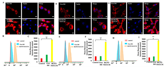 Cellular uptake measured through the CLSM and FCM assays. The confocal images (A,D,G) and the corresponding flow cytometry analysis (B,E,H) of bEnd.3, HUVECs, and C6 cells after exposure to free DiI and DiI-HCPTNS/CCM for 0.5 h at 37 °C at DiI concentration of 10 μg·mL −1, respectively. n = 3. Bars represent 20 μm. Image J was utilized to quantify the cellular uptake of free DiI and HCPT-NS/CCM in bEnd.3 (C), HUVECs (F) and C6 cells (I). (The data points represent the mean ± SD. ** indicates p < 0.01).
