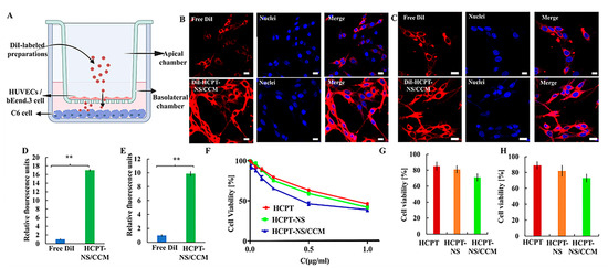 BBB is the main biological barrier that prevents the targeting of nanocarriers, and accumulation in the glioma region. In order to evaluate the BBB permeability of different HCPT preparations in an in vitro transwell model, an in vitro BBB model was successfully developed using the bEnd.3/C6 cells and the resistance value was 260.6 Ω·cm2 with the barrier function (Figure 4A). Results indicated that HCPT-NS/CCM had the strongest penetration ability (Figure 4B). Furthermore, the fluorescence intensity of the underlying solution was measured (Figure 4D). HCPT-NS/CCM was found to have the highest brightness, which was significantly different from free DiI, indicating the importance of the cancer cell membrane as a cross BBB camouflage. The BBTB is another major physiological obstacle of drug delivery [39]. BBTB was established by HUVECs/C6 cell co-culture model, with a resistance value of 258.7 Ω·cm2. The HCPT-NS/CCM had the strongest targeting ability, similar to the result of BBB (Figure 4C,E).