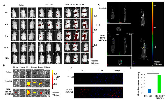 In vivo targeting evaluation. In vivo real-time imaging of saline, DiR-HCPT-NS, and DiR-HCPT-NS/CCM in glioma-bearing mice, n = 3 (A). Ex vivo fluorescence images of the brain and other major organs of mice treated intravenously with different DiR-encapsulated nanosuspensions (B). The brain CT tumor localization scan, which indicates that biomimetic nanosuspensions are able to effectively transport drugs to the brain tissue (C). Analysis of the permeability experiment of free DiI and HCPT-NS/CCM on brain tumor site of glioma mice (D). Image J was utilized to quantify the distribution of free DiI and HCPT-NS/CCM in brain of mice that bore intracranial C6 glioma (E). (DiI: red, DAPI: blue, by 40× object lens; The data points represent the mean ± SD. ** indicates p < 0.01).