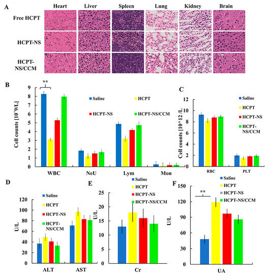 In order to identify the potential toxicity of different types of HCPT formulations in vivo, normal mice were randomly divided into four groups. They were administered 200 μL normal saline, free HCPT, HCPT-NS and HCPT-NS/CCM by tail vein every two days for 15 consecutive days at an HCPT dose of 8 mg·kg−1. All mice were euthanized one day after the last administration, after which the blood cells and serum biochemical indexes were examined. The heart, liver, spleen, lung, kidney and brain were harvested and stained using the histopathological examination.