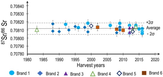 87Sr/86Sr as a function of the year of harvest of the 39 Champagnes from six different brands with the average and 2σ. The error bars (2σ) were obtained from a triplicate of the same sample.