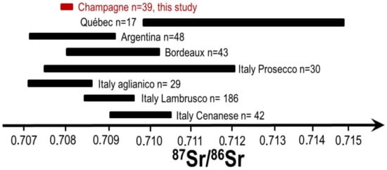 The huge diversity of production areas represents a real challenge to secure the provenance of wine. The wine composition is influenced by many factors such as soil, climate, grapevine variety, training system, vineyard floor management and other parameters linked to oenological practices and the use of additives [1,2]. In this context, for all wines, and more specifically here for sparkling wines, the Sr isotopic ratios can be considered as an important variable that will trace the “terroir” and the environment of the wine. Among different inorganic compounds, the level of Sr contained in wines directly originates from the vineyard soil. A series of studies demonstrate the continuous and conservative signature of 87Sr/86Sr ratios in the system soil–grapes–wine [3,4,5,6,7,8]. The specificity of the Sr isotopic ratio has also been used to trace wines and identify the vineyards which they originated from around the world. This ratio(87Sr/86Sr) has been applied for the identification of the geographical origin of wines from South Africa [8], Argentina [6], Canada [7], Portugal [3] and Romania [9]. The 87Sr/86Sr value is influenced by the age and composition of bedrocks underlying the vineyards [10]. In general, strontium is actively taken up by both plants and animals due to its similarities with calcium [11]. However, during the uptake of Sr and the metabolism pathway of the plant, the Sr isotopic ratio is unaffected so its signature is extremely conservative [5]. It remains generally unchanged throughout the process from grapes to wine [12,13].