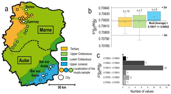 The musts are directly obtained from the gentle direct pressing of the grapes. They are the first stage of the different important steps of the Champagne elaboration. As musts have not been affected by the different processing steps that occur later in elaboration, their Sr isotopic ratio will reflect most closely with the geogenic signature from the soil. The entire AOC Champagne is located within the sedimentary Parisian Basin. The AOC area represents 33,000 hectares reflecting the similar nature of soils located on a large homogenous outcrop of the Parisian sedimentary basin. The vineyards of the AOC Champagne are located on homogenous bedrocks in terms of geology. The soil composition is also rather homogenous in Sr isotopic ratio in the production area. Champagne vineyards are located on chalk and dolomite originating from the Upper Cretaceous or Cenozoic areas in the Marne department and the Upper Jurassic in the Aube department. The Sr isotopic ratios measured in these geological formations ranges between 0.7075 and 0.7079 [21] which is in agreement with those obtained in all of the whole Champagne samples (0.70812). Figure 3 clearly displays that all the must samples have been collected either in the Marne department at the border of the Cenozoic and Upper-Cretaceous outcrops. All the other southern musts samples are located mainly in the Upper Jurassic outcrops. The median and the range of the Sr isotopic signatures of the musts in close relation with their geographical localization of the must’s origin is presented as boxplots in Figure 3b. The distribution of the musts over the isotope ratio range is presented in Figure 3b,c. The Sr isotopic ratios of the musts are slightly less homogenous than those obtained for the final Champagne products. Nevertheless, the musts are relatively narrow (min= 0.70898 and max = 0.70832) and the average of Sr isotopic ratio of the must is 87Sr/86Sr = 0.70817 (±0.00022σ, n = 25) while for the Champagne it is 87Sr/86Sr= 0.70812 (0.00007, 2σ, n = 39). The averages are quite similar, but the standard deviations are smaller for Champagne due to the blending.