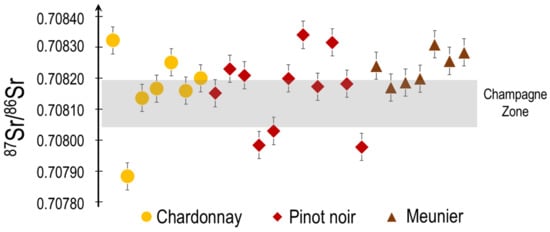 Impact of the Grape-Wines on the Sr Isotopic Signatures in the Musts: In the AOC of Champagnes, several grapevines varieties are planted and are used to produce the musts and base wines for the different brands of Champagne. The varieties most commonly used, in the AOC champagne, are Chardonnay, Pinot noir and Meunier. Sr isotopic ratios of musts as a function of grapevine variety are presented in Figure 4.